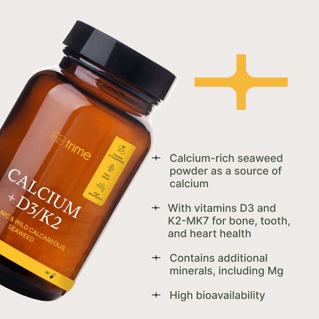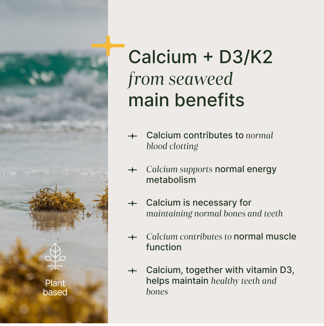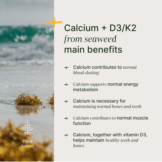Proszek z dzikich krasnorostów Lithothamnion superpositum w jakości organicznej to bogate źródło naturalnego wapnia, który naturalnie zawiera inne minerały. Dodatkowo, algi te są połączone z cholekalcyferolem, naturalną witaminą D3 z alg morskich bez GMO oraz witaminą K2 MK-7 z fermentowanej ciecierzycy. Połączenie wapnia i D3K2 tworzy synergistyczny suplement wspomagający zdrowie kości, zębów i układu sercowo-naczyniowego.