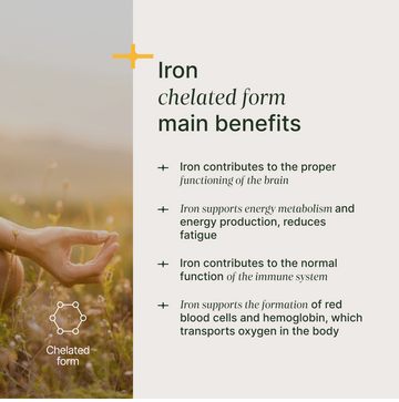 Żelazo jest ważne dla prawidłowego tworzenia czerwonych krwinek i hemoglobiny , transportu tlenu we krwi oraz wspierania prawidłowego funkcjonowania układu odpornościowego . To w pełni schelatowane żelazo zapewnia wysoką wchłanialność i jest łagodne dla żołądka i przewodu pokarmowego.