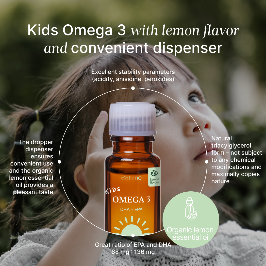 Kids Omega-3 są delikatnie ekstrahowane z mikroalg bogatych w DHA i EPA (kwas dokozaheksaenowy i eikozapentanowy) , niezbędne dla optymalnego rozwoju mózgu i wzroku od pierwszego trymestru ciąży. Pozyskiwane wyłącznie z naturalnych źródeł roślinnych.