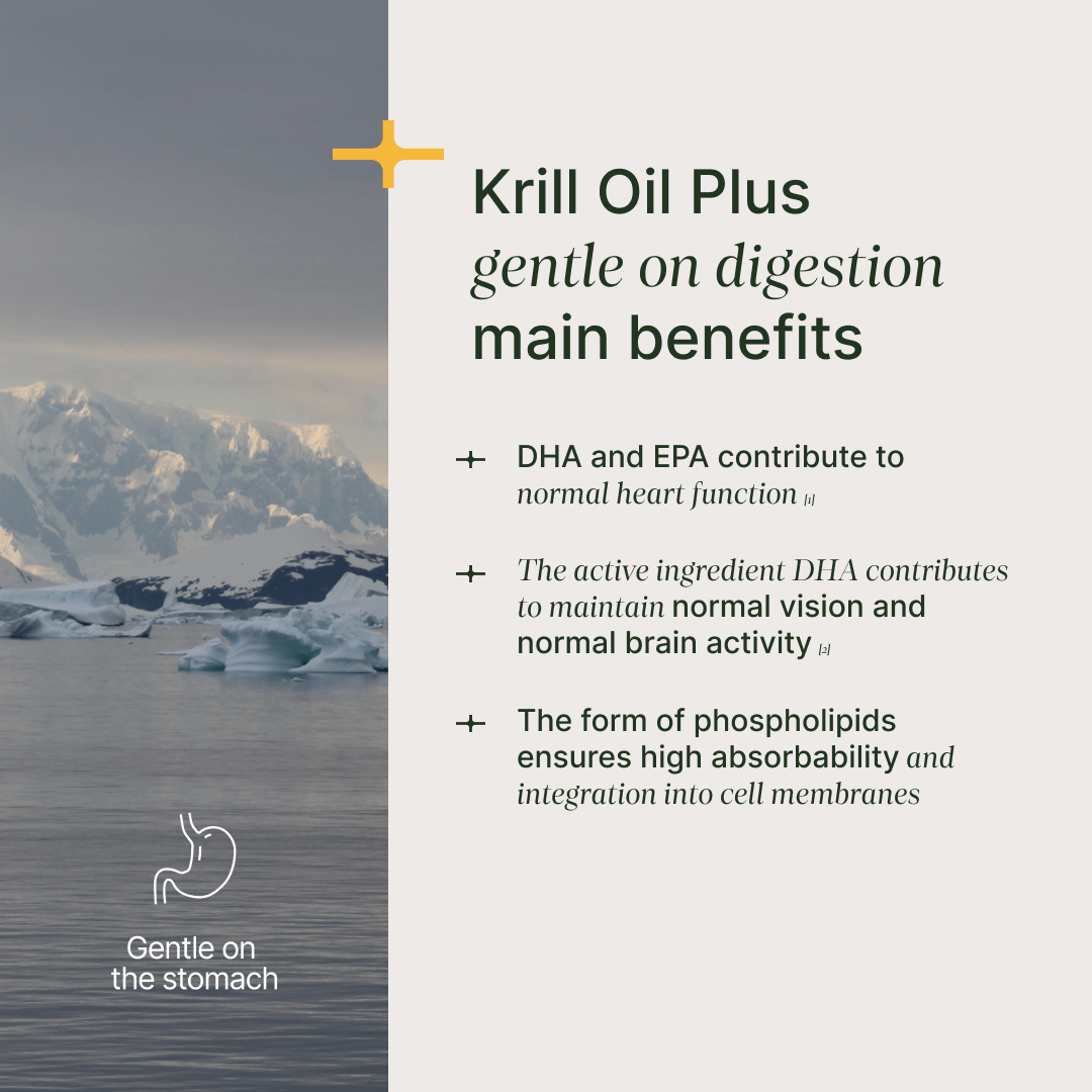 Krill Oil Plus pochodzi z dziewiczych wód antarktycznych z łowisk z certyfikatem MSC , co gwarantuje zrównoważone połowy i przyjazność dla środowiska. Olej z kryla jest bogatym źródłem kwasów tłuszczowych omega-3 EPA i DHA , a także zawiera naturalnie występującą astaksantynę i cholinę . Każda kapsułka zawiera aż 805 mg oleju z kryla, co zapewnia wysokie stężenie składników odżywczych w jednej porcji.