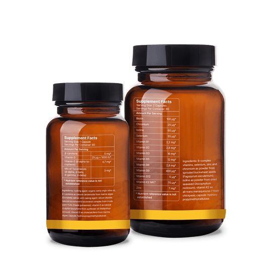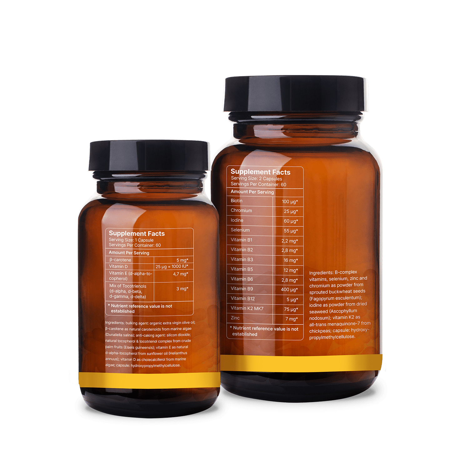 - Witamina D3 w postaci cholekalcyferolu z czystego źródła roślinnego – alg bez GMO